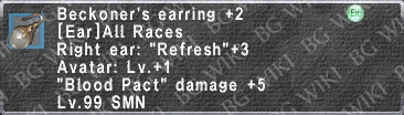 | ??? Earring: SMN +2 | A Beck. Earring +2 File:AugRank.png will always be received when using this item. |