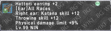 ??? Earring: NIN +2 | A Hattori Earring +2 File:AugRank.png will always be received when using this item. |